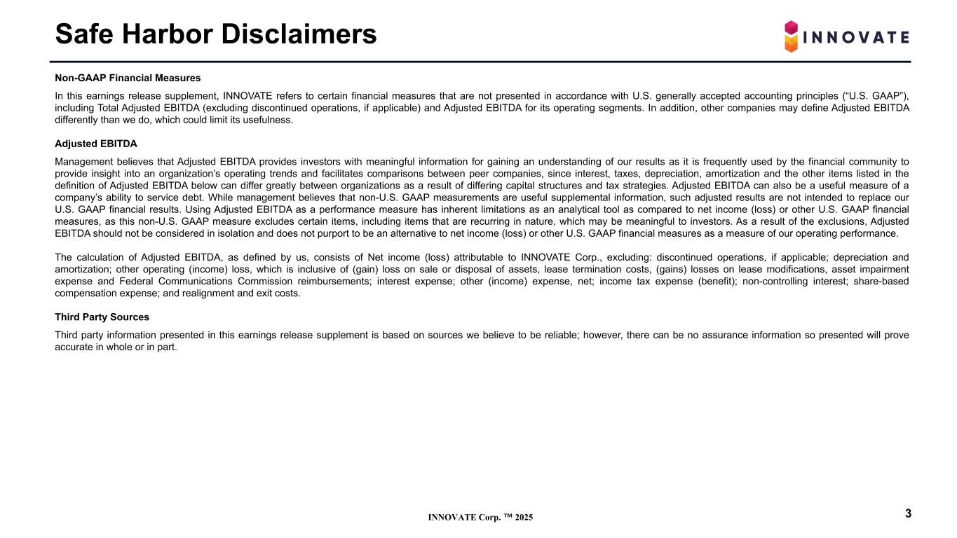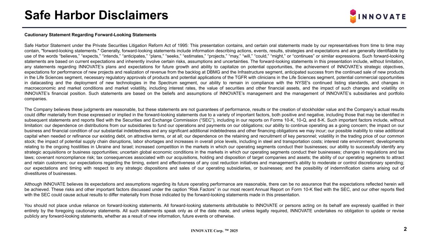 INNOVATE Corp. ™ 2025 Safe Harbor Disclaimers 2 Cautionary Statement Regarding Forward-Looking Statements Safe Harbor Statement under the Private Securities Litigation Reform Act of 1995: This presentation contains, and certain oral statements made by our representatives from time to time may contain, "forward-looking statements." Generally, forward-looking statements include information describing actions, events, results, strategies and expectations and are generally identifiable by use of the words “believes,” “expects,” “intends,” “anticipates,” “plans,” “seeks,” “estimates,” “projects,” “may,” “will,” “could,” “might,” or “continues” or similar expressions. Such forward-looking statements are based on current expectations and inherently involve certain risks, assumptions and uncertainties. The forward-looking statements in this presentation include, without limitation, any statements regarding INNOVATE’s plans and expectations for future growth and ability to capitalize on potential opportunities, the achievement of INNOVATE’s strategic objectives, expectations for performance of new projects and realization of revenue from the backlog at DBMG and the Infrastructure segment, anticipated success from the continued sale of new products in the Life Sciences segment, necessary regulatory approvals of products and potential applications of the TGFR with clinicians in the Life Sciences segment, potential commercial opportunities in datacasting and the deployment of new technologies in the Spectrum segment, our ability to remain in compliance with the NYSE's continued listing standards, and changes in macroeconomic and market conditions and market volatility, including interest rates, the value of securities and other financial assets, and the impact of such changes and volatility on INNOVATE’s financial position. Such statements are based on the beliefs and assumptions of INNOVATE’s management and the management of INNOVATE’s subsidiaries and portfolio companies. The Company believes these judgments are reasonable, but these statements are not guarantees of performance, results or the creation of stockholder value and the Company’s actual results could differ materially from those expressed or implied in the forward-looking statements due to a variety of important factors, both positive and negative, including those that may be identified in subsequent statements and reports filed with the Securities and Exchange Commission (“SEC”), including in our reports on Forms 10-K, 10-Q, and 8-K. Such important factors include, without limitation: our dependence on distributions from our subsidiaries to fund our operations and payments on our obligations; our ability to continue operating as a going concern; the impact on our business and financial condition of our substantial indebtedness and any significant additional indebtedness and other financing obligations we may incur; our possible inability to raise additional capital when needed or refinance our existing debt, on attractive terms, or at all; our dependence on the retaining and recruitment of key personnel; volatility in the trading price of our common stock; the impact of potential supply chain disruptions, labor shortages and increases in overall price levels, including in steel and transportation costs; interest rate environment; developments relating to the ongoing hostilities in Ukraine and Israel; increased competition in the markets in which our operating segments conduct their businesses; our ability to successfully identify any strategic acquisitions or business opportunities; uncertain global economic conditions in the markets in which our operating segments conduct their businesses; changes in regulations and tax laws; covenant noncompliance risk; tax consequences associated with our acquisitions, holding and disposition of target companies and assets; the ability of our operating segments to attract and retain customers; our expectations regarding the timing, extent and effectiveness of any cost reduction initiatives and management’s ability to moderate or control discretionary spending; our expectations and timing with respect to any strategic dispositions and sales of our operating subsidiaries, or businesses; and the possibility of indemnification claims arising out of divestitures of businesses. Although INNOVATE believes its expectations and assumptions regarding its future operating performance are reasonable, there can be no assurance that the expectations reflected herein will be achieved. These risks and other important factors discussed under the caption “Risk Factors” in our most recent Annual Report on Form 10-K filed with the SEC, and our other reports filed with the SEC could cause actual results to differ materially from those indicated by the forward-looking statements made in this presentation. You should not place undue reliance on forward-looking statements. All forward-looking statements attributable to INNOVATE or persons acting on its behalf are expressly qualified in their entirety by the foregoing cautionary statements. All such statements speak only as of the date made, and unless legally required, INNOVATE undertakes no obligation to update or revise publicly any forward-looking statements, whether as a result of new information, future events or otherwise.