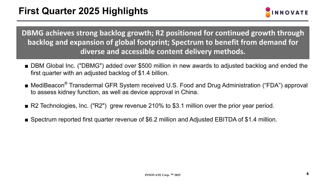 “We entered the year with strong momentum that positions us well to build on our strategic priorities and drive growth in 2025,” stated Paul Voigt, INNOVATE's Interim CEO. “In the first quarter, DBMG added a few substantial projects to the adjusted backlog, amounting to more than $500 million, and we continue to be optimistic on the pipeline for the remainder of the year. At Life Sciences, on the heels of the FDA's approval of the TGFR, MediBeacon looks forward to exploring potential applications with clinicians both in the hospital and outpatient settings. R2 kicked off 2025 by tripling its year-over-year revenue and continued expanding sales and distribution into key international markets. Broadcasting is also experiencing a strong start to 2025 with the
