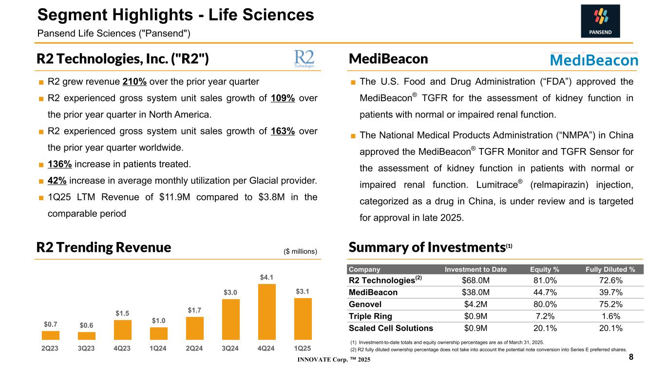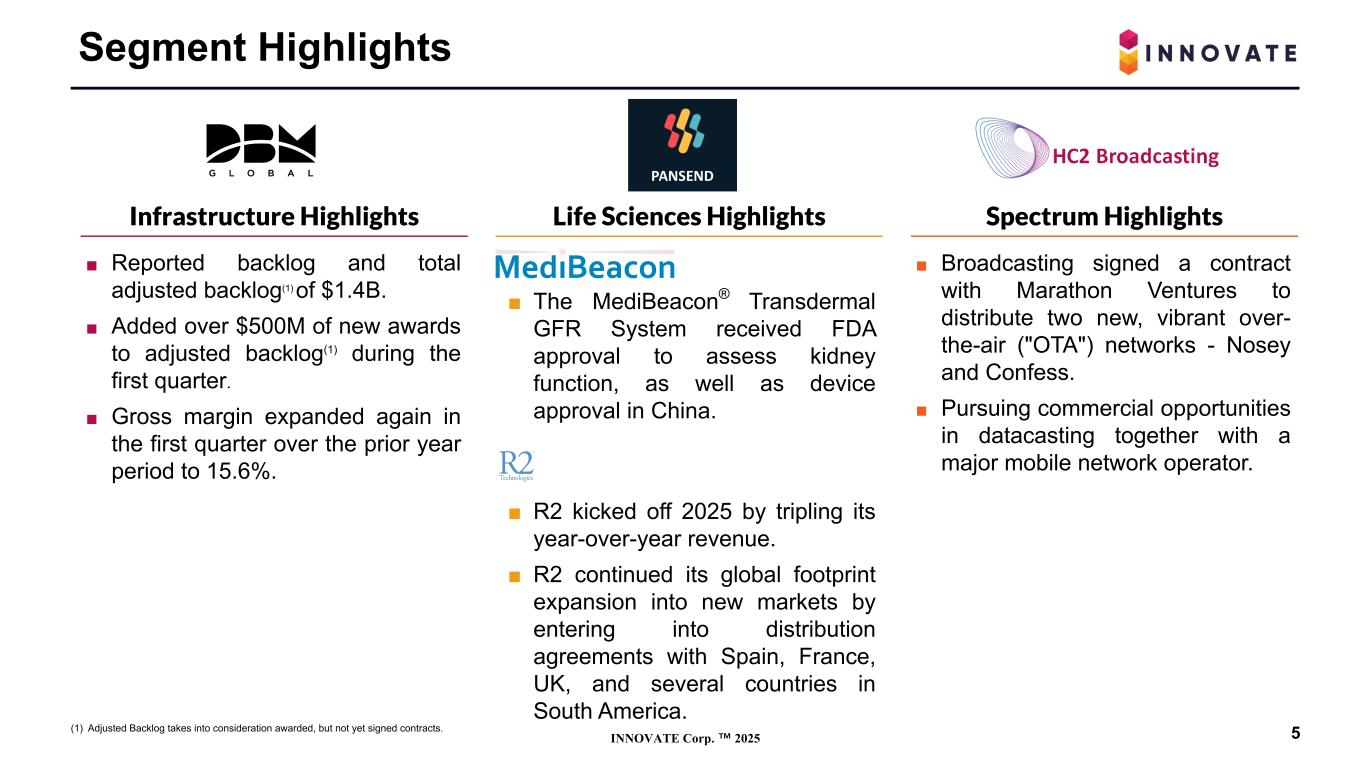“To begin 2025, INNOVATE has made meaningful progress on key initiatives that has strengthened the foundation across our three operating segments,” said Avie Glazer, Chairman of INNOVATE. “The Infrastructure segment expanded its adjusted backlog to $1.4 billion in the first quarter, reflecting the team's continued efforts to secure new projects that will drive sustained growth in the future. We are seeing great momentum in Life Sciences with MediBeacon's previously announced FDA approval of its TGFR system in January, which started the year on the front foot while R2 delivered strong year-over-year growth. The Spectrum segment delivered consistent year-over-year performance, demonstrating resilience and operational stability amid a dynamic market environment.”