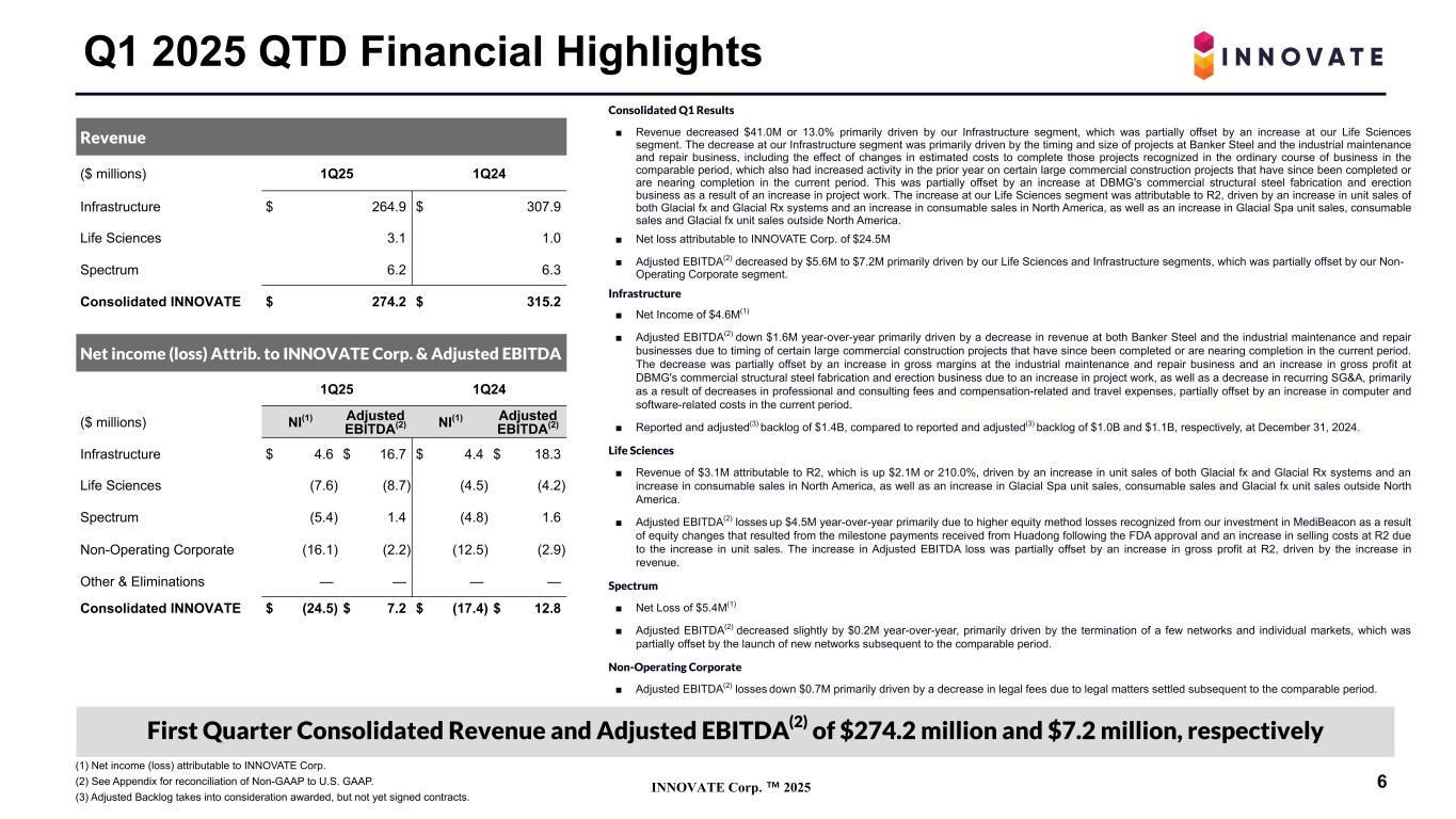 •Revenue: For the first quarter of 2025, INNOVATE's consolidated revenue was $274.2 million, a decrease of 13.0%, compared to $315.2 million for the prior year quarter. The decrease was primarily driven by our Infrastructure segment, which was partially offset by an increase at our Life Sciences segment. The decrease at our Infrastructure segment was primarily driven by the timing and size of projects at Banker Steel and the industrial maintenance and repair business, including the effect of changes in estimated costs to complete those projects recognized in the ordinary course of business in the comparable period,