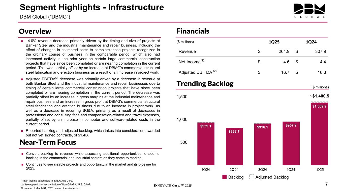 •DBM Global ("DBMG") reported first quarter 2025 revenue of $264.9 million, a decrease of 14.0%, compared to $307.9 million in the prior year quarter. Net income attributable to INNOVATE was $4.6 million, compared to $4.4 million for the prior year quarter. Adjusted EBITDA decreased to $16.7 million from $18.3 million in the prior year quarter.