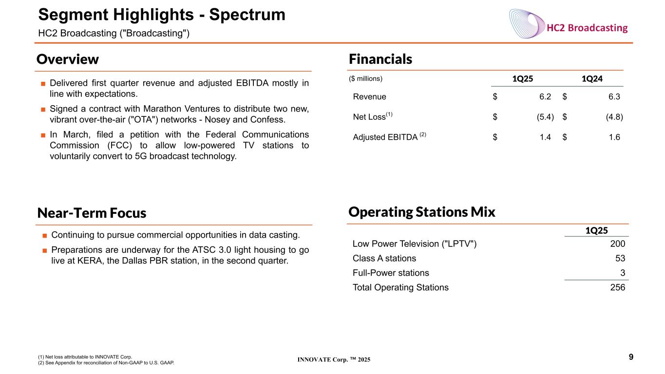 •Broadcasting reported first quarter 2025 revenue of $6.2 million, compared to $6.3 million in the prior year quarter. Net loss attributable to INNOVATE was $5.4 million compared to $4.8 million in the prior year quarter. Adjusted EBITDA was $1.4 million, compared to $1.6 million in the prior year quarter.