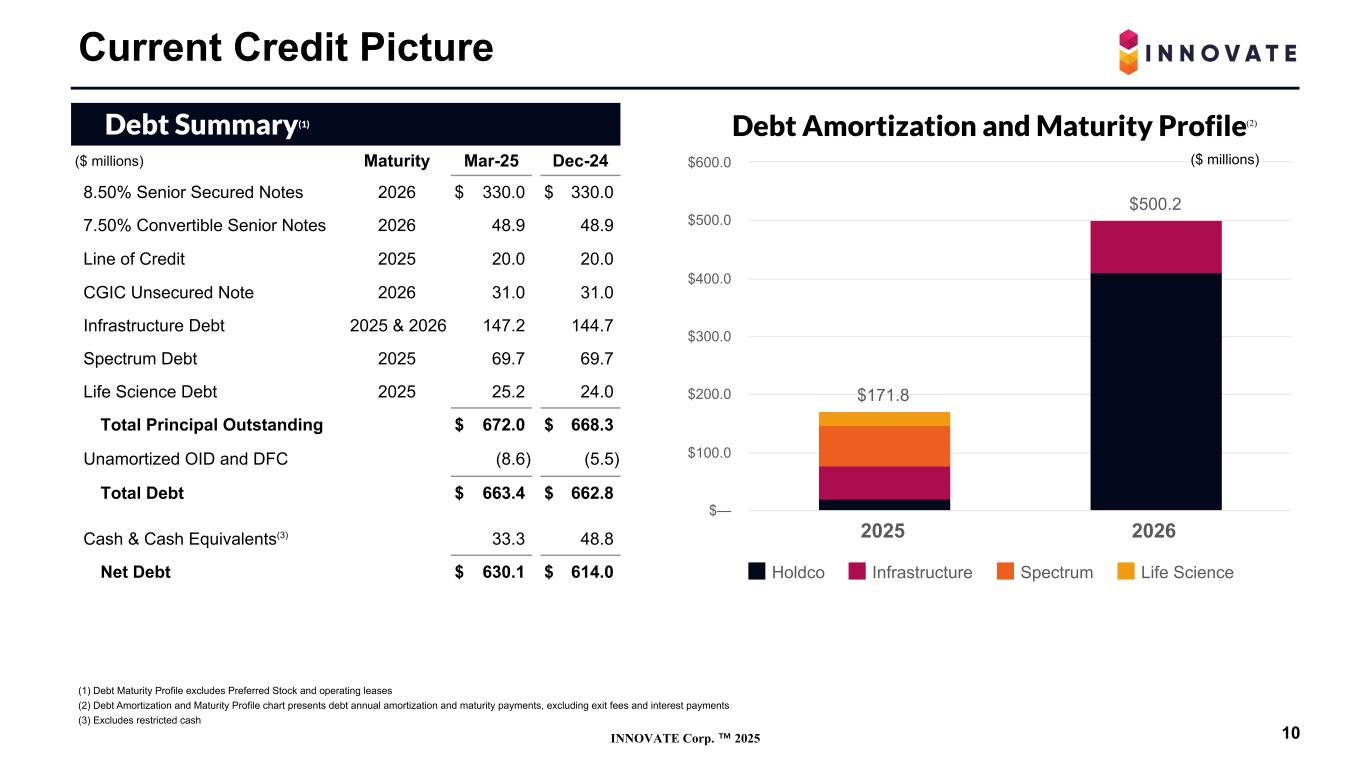 INNOVATE Corp. ™ 2025 (1) Debt Maturity Profile excludes Preferred Stock and operating leases (2) Debt Amortization and Maturity Profile chart presents debt annual amortization and maturity payments, excluding exit fees and interest payments (3) Excludes restricted cash Debt Summary(1) ($ millions) Maturity Mar-25 Dec-24 8.50% Senior Secured Notes 2026 $ 330.0 $ 330.0 7.50% Convertible Senior Notes 2026 48.9 48.9 Line of Credit 2025 20.0 20.0 CGIC Unsecured Note 2026 31.0 31.0 Infrastructure Debt 2025 & 2026 147.2 144.7 Spectrum Debt 2025 69.7 69.7 Life Science Debt 2025 25.2 24.0 Total Principal Outstanding $ 672.0 $ 668.3 Unamortized OID and DFC (8.6) (5.5) Total Debt $ 663.4 $ 662.8 Cash & Cash Equivalents(3) 33.3 48.8 Net Debt $ 630.1 $ 614.0 Current Credit Picture 10 Debt Amortization and Maturity Profile $171.8 $500.2 Holdco Infrastructure Spectrum Life Science 2025 2026 $— $100.0 $200.0 $300.0 $400.0 $500.0 $600.0 ($ millions) (2)