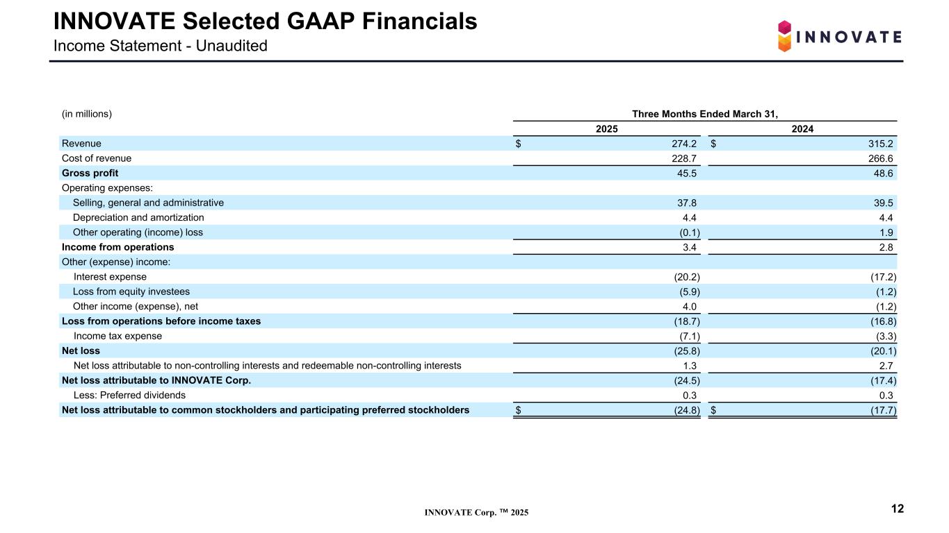 •Net Loss: For the first quarter of 2025, INNOVATE reported a Net loss attributable to common stockholders and participating preferred stockholders of $24.8 million, or $1.89 per fully diluted share, compared to $17.7 million, or $2.21 per fully diluted share, for the prior year quarter, which has been retroactively adjusted to reflect the 1-for-10 reverse stock split effected on August 8, 2024. The increase in Net loss was primarily due to an increase of $4.7 million in loss from equity investees, a $3.8 million increase in tax expense, a net decrease in gross profit of $3.1 million, and a $3.0 million increase in interest expense, which was partially offset by a $5.2 million increase in other income, net, a $2.0 million decrease in other operating loss, and a decrease in selling, and general and administrative (“SG&A”) expenses of $1.7 million. The overall increase in loss from equity investees was due to an increase in losses recognized from MediBeacon as a result of equity changes that resulted from the milestone payments received from Huadong following FDA approval. The increase in tax expense was primarily driven by the impact of projected pre-tax results on the annual effective tax rate and the limitations on the utilization of net operating losses (“NOL”) by INNOVATE's U.S. consolidated group as a result of the Internal Revenue Code Section 382 and the Tax Cuts and Jobs Act's 80 percent limitation on NOLs incurred after 2017. The decrease in gross profit was primarily driven by our Infrastructure segment due to timing and size of projects that have since been completed or are nearing completion in the current period, including the effect of changes in estimated costs to complete those projects recognized in the ordinary course of business in the comparable period, which was partially offset by an increase in gross profit at our Life Sciences segment primarily driven by R2 as a result of an increase Glacial unit sales and consumable sales over the comparable period. The increase in interest expense was primarily attributable to increases in exit fees and a higher outstanding principal balance at our Life Sciences segment as a result of the capitalization of unpaid interest into the principal balance subsequent to the comparable period. The overall increase in other income, net was primarily driven by step-up gain following MediBeacon's FDA approval in January 2025. The decrease in other operating loss was primarily driven by an unrepeated loss related to a plant closure at our Infrastructure segment in the comparable period. The overall decrease in SG&A expenses was primarily driven by decreases in professional and consulting fees, compensation-related and travel expenses at our Infrastructure segment, which was partially offset by an increase in computer and software-related costs in the current period at our Infrastructure segment and an increase in selling costs at R2 due to an increase in unit sales.