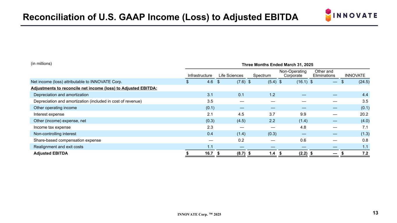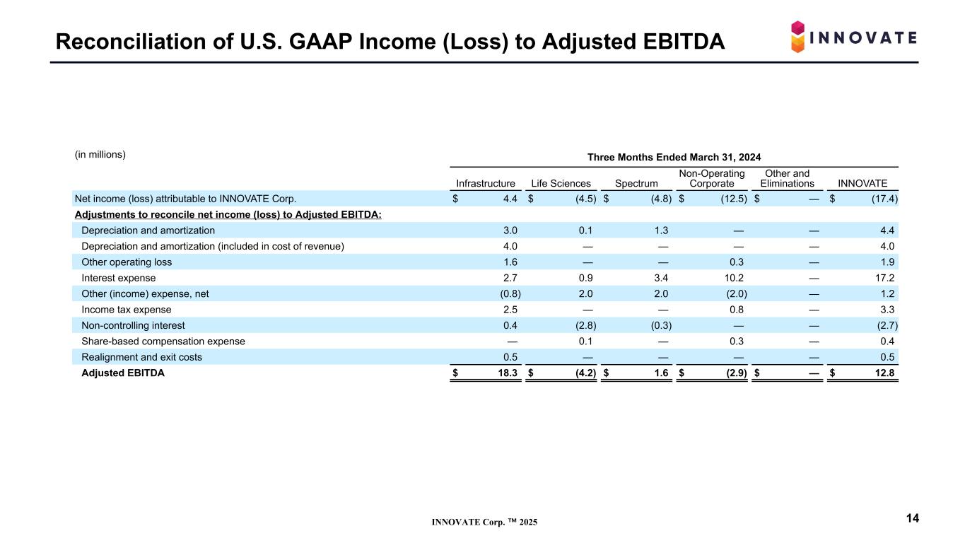INNOVATE Corp. ™ 2025 Reconciliation of U.S. GAAP Income (Loss) to Adjusted EBITDA 13 (in millions) Three Months Ended March 31, 2025 Infrastructure Life Sciences Spectrum Non-Operating Corporate Other and Eliminations INNOVATE Net income (loss) attributable to INNOVATE Corp. $ 4.6 $ (7.6) $ (5.4) $ (16.1) $ — $ (24.5) Adjustments to reconcile net income (loss) to Adjusted EBITDA: Depreciation and amortization 3.1 0.1 1.2 — — 4.4 Depreciation and amortization (included in cost of revenue) 3.5 — — — — 3.5 Other operating income (0.1) — — — — (0.1) Interest expense 2.1 4.5 3.7 9.9 — 20.2 Other (income) expense, net (0.3) (4.5) 2.2 (1.4) — (4.0) Income tax expense 2.3 — — 4.8 — 7.1 Non-controlling interest 0.4 (1.4) (0.3) — — (1.3) Share-based compensation expense — 0.2 — 0.6 — 0.8 Realignment and exit costs 1.1 — — — — 1.1 Adjusted EBITDA $ 16.7 $ (8.7) $ 1.4 $ (2.2) $ — $ 7.2